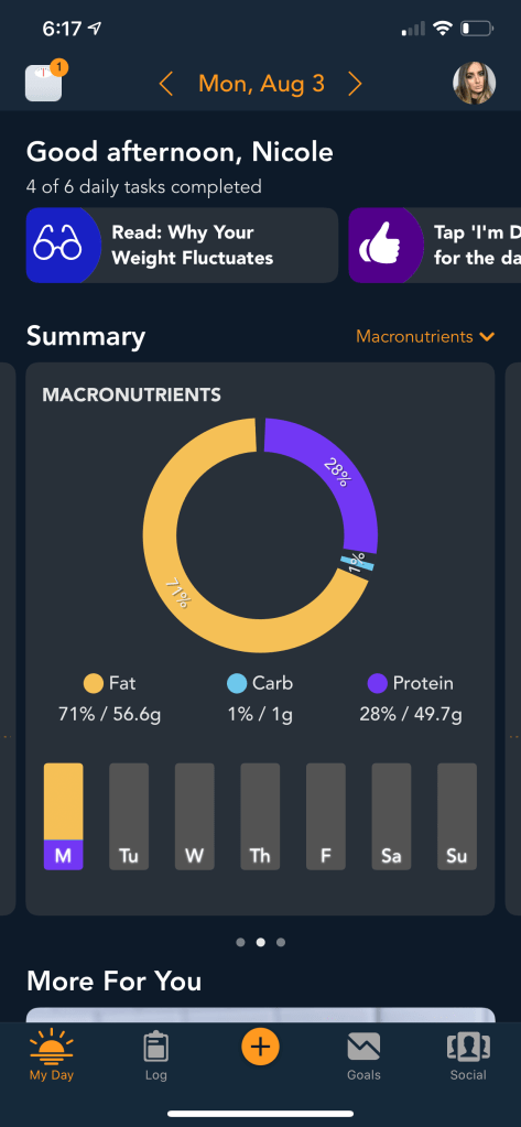 At this point, I had been gluten free for about a year and although that had significantly helped with some digestive issues, sugar and processed crap, and vegetables were still part of my diet and my period symptoms didn’t change. Fast forward a year, I looked into the ketogenic diet. I had done some research and reading and learned that the Keto diet helped with endometriosis and PCOS, both of these conditions generated excruciating PMS and period type symptoms. So I gave that a try! Keto was less than 50 net carbs per day, however you were still able to eat vegetables since it was all about net carbs (carbs-fiber=net carbs). My mood stabilized when I tried keto, I still had some bloating on that time of the month but I wasn’t breaking down during those depressive days. At this point, a little relief was worth it to me. I continued to do Keto and low carb on and off for the next two years.